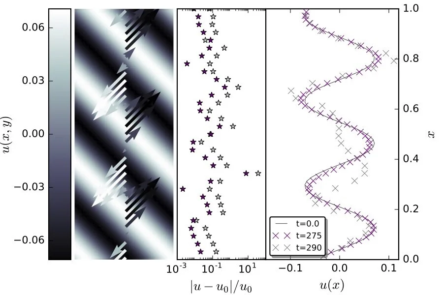The same skewed shear flow experiment as in Figure 2, with a 4×higher wavenumber. The initial conditions for thesimulations are shown in the left panel. The color scale in the image corresponds to the x-velocity,u(y). The overlaid arrowsgive a visual representation of the velocity field. In the right panel, the initial, analytic solution is shown in the solid lines, and the numerical solution evolved for t∼60 sound crossing times is shown in dots. The purple ×’s show the simulation as the numerical dispersion begins to manifest, and the grey ×’s show the solution as the wave begins to display unsteady behavior. The corresponding residuals, (u−u0)/u0, are shown in grey and purple stars in the middle panel. We initialize the simulation using Equations 18 on a 64×64 zone grid with four times the wavenumber as in Figure 2. The amplitude of the shear flowisA= 0.1, the sound speed is cs= 1 and the domain length is Lx,Ly=√2π. It is evident that the increase in wavenumberincreases the numerical dispersion, as expected