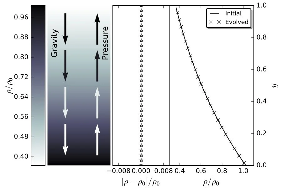 The evolution of a shear flow in the presence of a vertical hydrostatic equilibrium. The initial conditions for the simulation are shown in the left panel. The color scale in the image corresponds to the normalized density,ρ/ρ0. The overlaid arrows give a visual representation of the magnitude and direction of the gravitational body force balanced by the pressure induced by the density gradient. In the right panel, the initial, analytic solution for the density is shown in the solid line, and the numerical solution evolved to 50 sound crossing times is shown in ×’s. The corresponding residuals, (ρ−ρ0)/ρ0, are shown in grey stars in the middle panel. The simulation was run on a 64×64 zone grid, where Lx=Ly= 1,cs= 1,ρ0= 1, and g=−1. It is evident that with the proposed update, the scheme is able to maintain the hydrostatic equilibrium imposed by the external body forces.