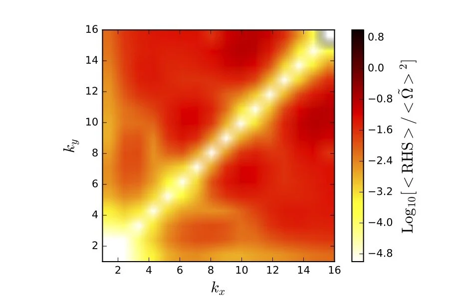 A numerical assessment of vorticity preservation for discrete wavenumber, vortical modes up to the Nyquist frequency. We present the RMS of the residual (RHS) of the vorticity equation normalized by the RMS of the original seeded vorticity fora range of vortical modes. The x and y axes correspond to the wavenumbers kx and ky of the seeded vortical mode. The kx,ky= 0 modes correspond to unskewed shear layers, which have been shown analytically to be vorticity preserving